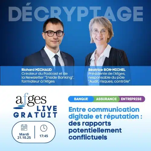 Avec la participation de Richard Michaud, créateur du Podcast et de la Newsletter “Inside Banking”, formateur à l’Afges et de Béatrice BON-MICHEL, Présidente de l’Afges et responsable du pôle “Audit, risques et contrôle”.