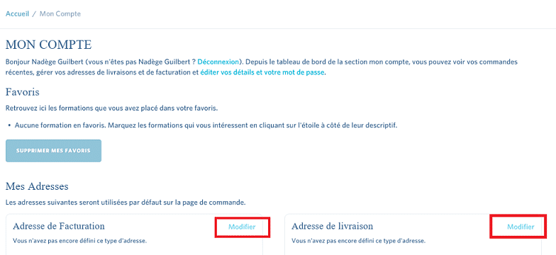 - Vous arrivez alors sur votre espace personnel. Il vous reste à renseigner vos adresses en cliquant sur les boutons Modifier.